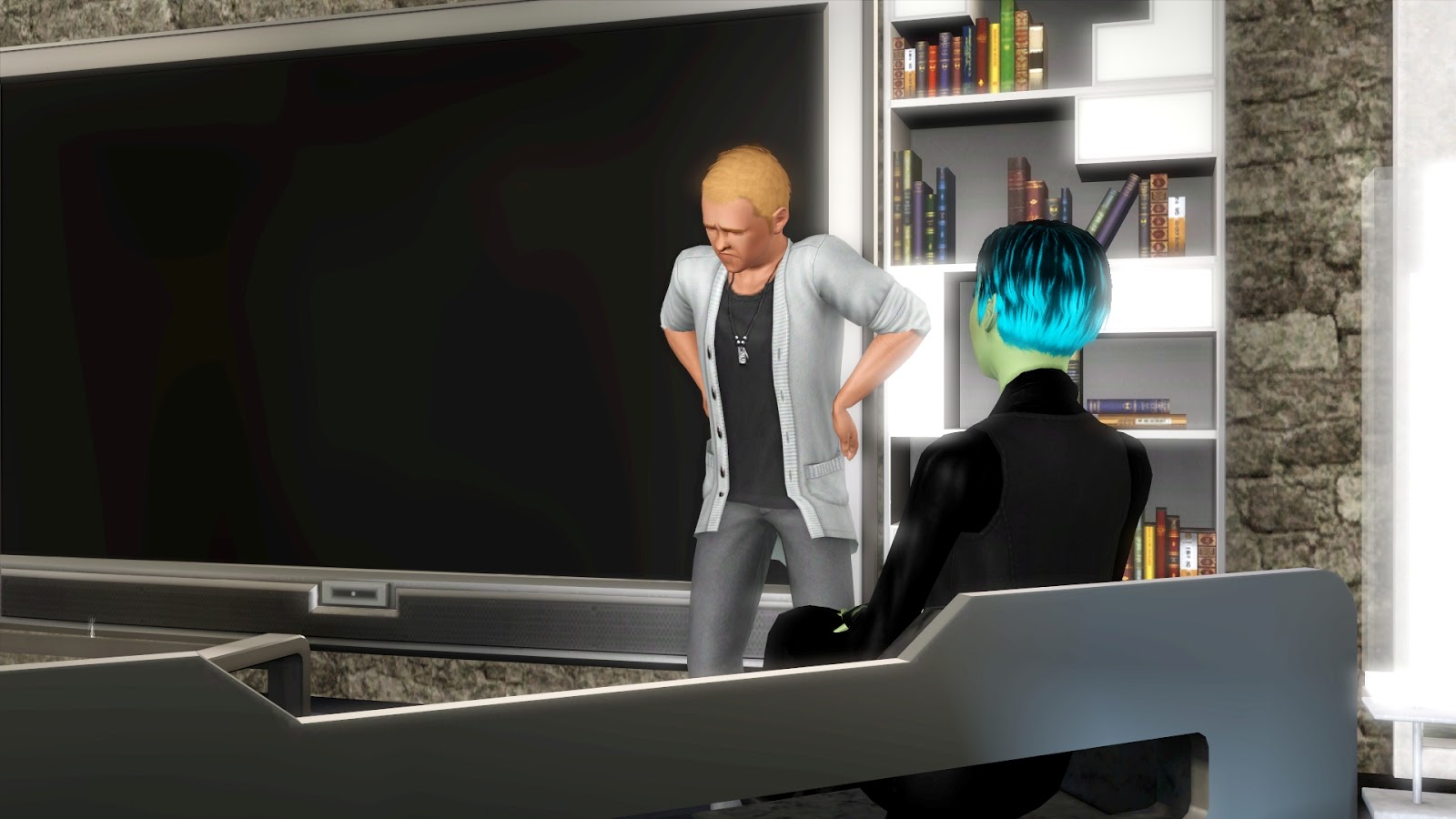 Later that evening Kelly was walking down the hall when she saw Mirabelle just outside her room. She walked up to her alien girlfriend and held her hand. Mirabelle almost took her hand as the two were about to retreat into the bedroom, but stopped when Kelly heard something off in the other room. She walked over to John and Scarlett's door and knocked on it. Scarlett alone was the only one inside, as John was apparently putting the final touches on that blocking device upstairs.